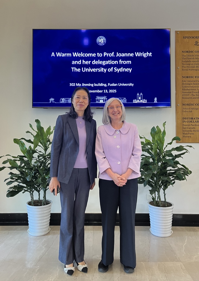 11月13日,悉尼大学分管教育与学生事务副校长乔安妮·赖特教授(Prof. Joanne Wright)率代表团访问复旦大学,常务副校长许征在马锦明楼会见了来宾。