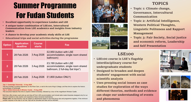 请确认报名的学生将个人英文简历在2026/3/9下午3点前提交到exchange@fudan.edu.cn陈老师的邮箱,邮件标题必须注明“LSE暑期班(language Center)报名2026+Option(数字)+姓名”,并完成ehall上的报名。